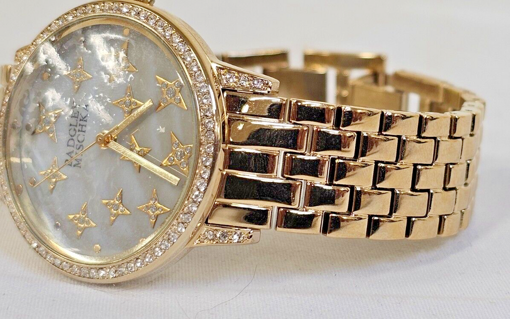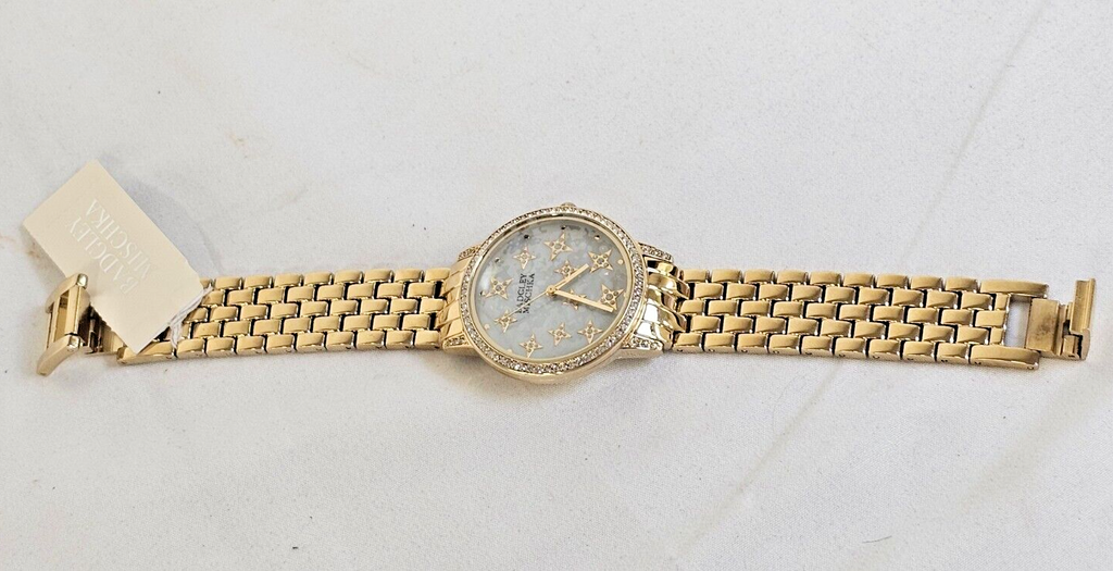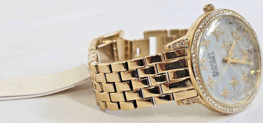 Gold-tone Bracelet Watch with Star Accents by Badgley Mischka. This round (35mm x 41mm) gold-tone case features 82 clear Swarovski crystals. The dial is white genuine mother-of-pearl with a Swarovski crystal-accented star motif. The gold-tone bracelet closes with a jewelry clasp with 1 extender link. The timepiece is water-resistant to 100 feet.