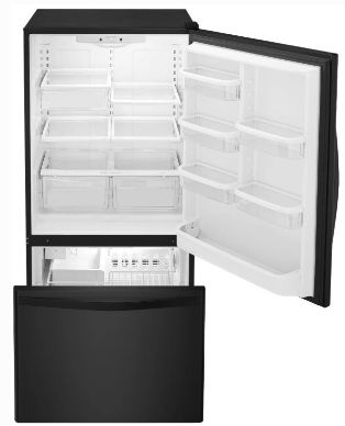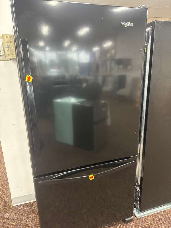 33 Inch Bottom-Freezer Refrigerator with 21.9 cu. ft. Capacity Keep your food fresh and organized with Whirlpool's bottom-freezer refrigerator. Within the refrigerator are four spill safe cantilever shelves, two crisper bins, four adjustable door bins, and two fixed door bins. The freezer contains two full width sliding baskets and an ice maker. LED lighting makes it easy to see fresh and frozen food. It puts a spotlight on food and casts a more natural light on the contents of your refrigerator so food looks as it should.