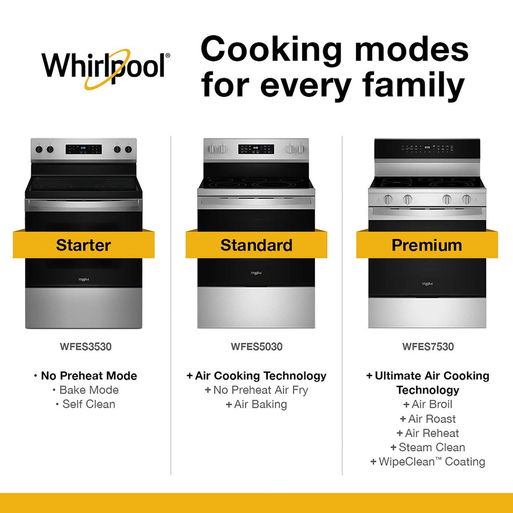 This Whirlpool WFES5030RZ offers exceptional performance and reliability. Air Cooking technology Add convenience to your cooking and spice up the menu with the added power of No Preheat Air Fry and Air Baking. No Preheat Air Fry Save up to 20 minutes* with No Preheat Air Fy. Get the right heat at the right time with our most advanced Air Fry mode. Get fast, crispy results on chicken wings and mozzarella sticks without the guilt. *Compared to WFE550S0LZ. Air Baking Go from gooey to golden and get even results when backing on multiple racks with Air Baking. Our high-speed fan optimizes air flow and drives consitent heat throughout the oven. Get golden results on breads, pastries and deserts with Air Baking. Designed for modern homes, this appliance combines advanced technology with user-friendly operation. Includes 1 Year Full Manufacturer Warranty for complete peace of mind.