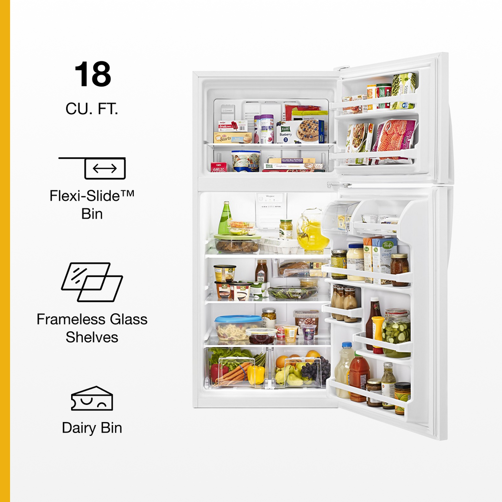 This Whirlpool WRT318FZDW offers exceptional performance and reliability. Up-front electronic controls Make it easy to regulate the interior temperature.. Wall-to-wall frameless glass shelves Include 2 adjustable shelves and 1 fixed shelf that help you keep your groceries organized.. Humidity-controlled crispers Help maintain the freshness of your produce. Designed for modern homes, this appliance combines advanced technology with user-friendly operation. Includes 1 Year Full Manufacturer Warranty for complete peace of mind.