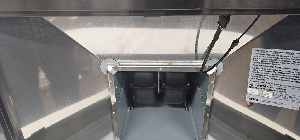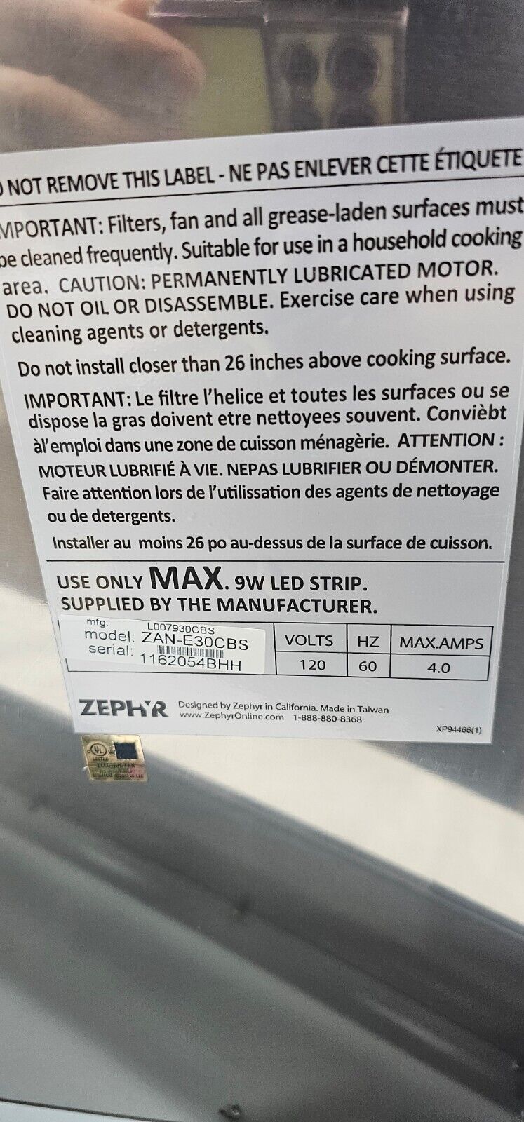 Dual-Level LightingKey SpecsProduct Height27 inchesProduct Width29 15/16 inchesProduct Depth22 1/16 inchesExhaust Vent LocationTopVent TypeConvertibleVent StyleConvertibleColor FinishBlack stainless steelGeneralProduct NameAnzio 30 in. 600 CFM Wall Mount Range Hood with LED LightBrandZephyrModel NumberZAN-E30CBSColorBlack Stainless SteelColor FinishBlack stainless steelDimensionProduct Height27 inchesMinimum Installation Height Above Cooktop26 inchesMaximum Installation Height Above Cooktop36 inchesProduct Width29 15/16 inchesProduct Depth22 1/16 inchesStandardized Width30 inchesProduct Weight36.2 poundsDuct ShapeRoundFeaturesExhaust Vent LocationTopVent TypeConvertibleVent StyleConvertibleRange Hood TypeWallNumber of Fan Speeds5Temperature SensorNoControl TypeButtonDelay Shut-OffYesRemote ControlNoAuto Fan Shut-OffYesIntegrated Light(s)YesNumber of Lights1Number of Light Levels2Bulb Type RequiredLEDBulb(s) IncludedYesMaximum Bulb Wattage9 wattsFilter InfoFilter MaterialOtherRemovable Grease FilterYesElectrical SpecificationAmperage4 amperesVoltage120 voltsCertifications Listings & ApprovalsProduct Safety Certifications and StandardsUL ListedWarrantyManufacturer's Warranty - PartsNot providedManufacturer's Warranty - LaborNot providedOtherUPC646328005305