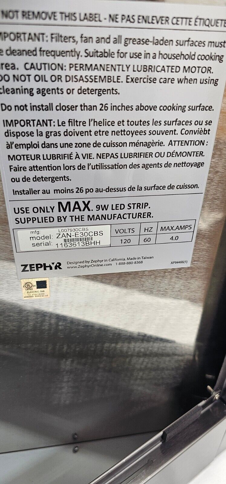 Dual-Level LightingKey SpecsProduct Height27 inchesProduct Width29 15/16 inchesProduct Depth22 1/16 inchesExhaust Vent LocationTopVent TypeConvertibleVent StyleConvertibleColor FinishBlack stainless steelGeneralProduct NameAnzio 30 in. 600 CFM Wall Mount Range Hood with LED LightBrandZephyrModel NumberZAN-E30CBSColorBlack Stainless SteelColor FinishBlack stainless steelDimensionProduct Height27 inchesMinimum Installation Height Above Cooktop26 inchesMaximum Installation Height Above Cooktop36 inchesProduct Width29 15/16 inchesProduct Depth22 1/16 inchesStandardized Width30 inchesProduct Weight36.2 poundsDuct ShapeRoundFeaturesExhaust Vent LocationTopVent TypeConvertibleVent StyleConvertibleRange Hood TypeWallNumber of Fan Speeds5Temperature SensorNoControl TypeButtonDelay Shut-OffYesRemote ControlNoAuto Fan Shut-OffYesIntegrated Light(s)YesNumber of Lights1Number of Light Levels2Bulb Type RequiredLEDBulb(s) IncludedYesMaximum Bulb Wattage9 wattsFilter InfoFilter MaterialOtherRemovable Grease FilterYesElectrical SpecificationAmperage4 amperesVoltage120 voltsCertifications Listings & ApprovalsProduct Safety Certifications and StandardsUL ListedWarrantyManufacturer's Warranty - PartsNot providedManufacturer's Warranty - LaborNot providedOtherUPC646328005305